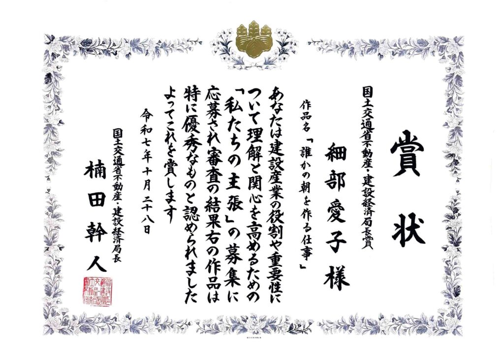 当社の建設統括グループの細部が、国土交通省主催「建設産業に関する作文コンクール」において、
